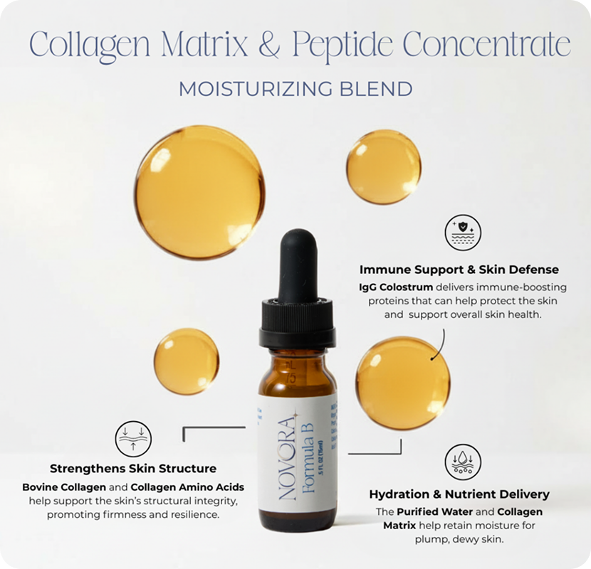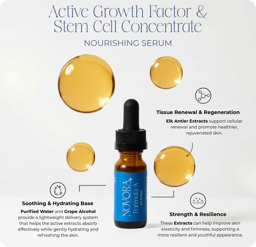 NOVORA is formulated to deliver clinically proven skincare ingredients, specifically velvet antler extract and bovine colostrum extract , directly to the dermis. As a result, you can experience lasting results that become more evident over time.